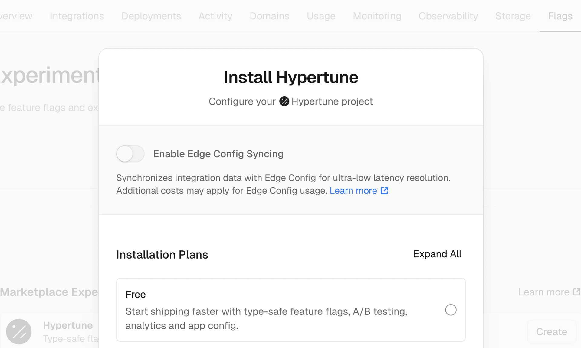 Today, we're releasing Hypertune as a native app in the Vercel Marketplace. Install it directly from the Flags tab of your Vercel dashboard in one click, and start using feature flags and running experiments in minutes.